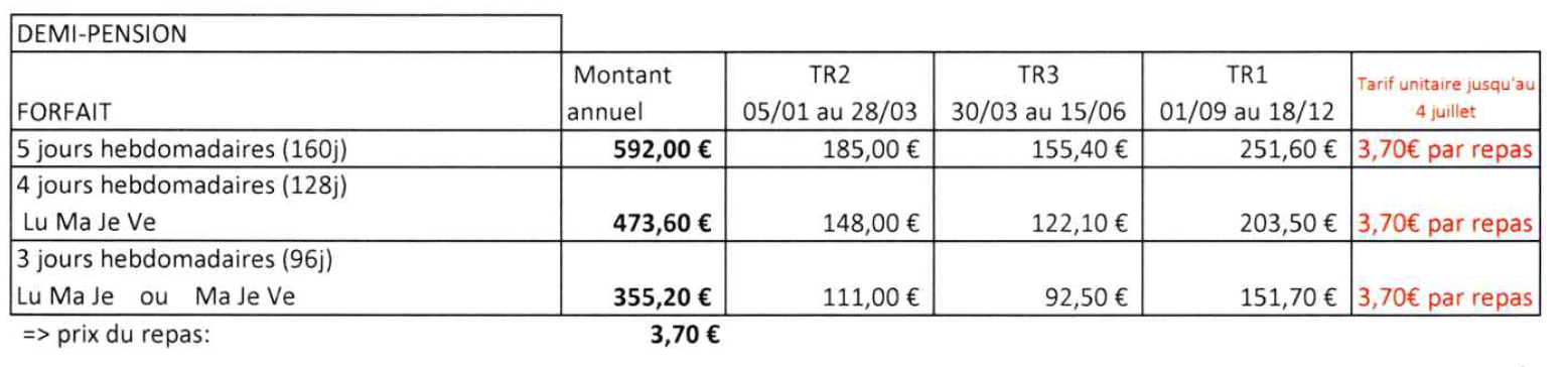 TARIFS PENSION ET DEMI-PENSION 2026