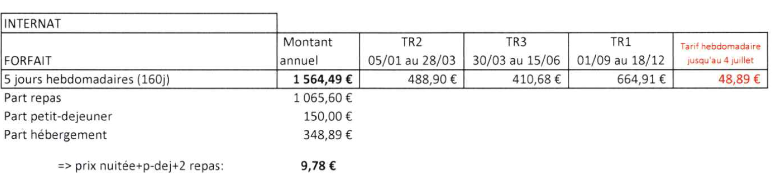 Pension : forfait internat 5 jours/4nuits